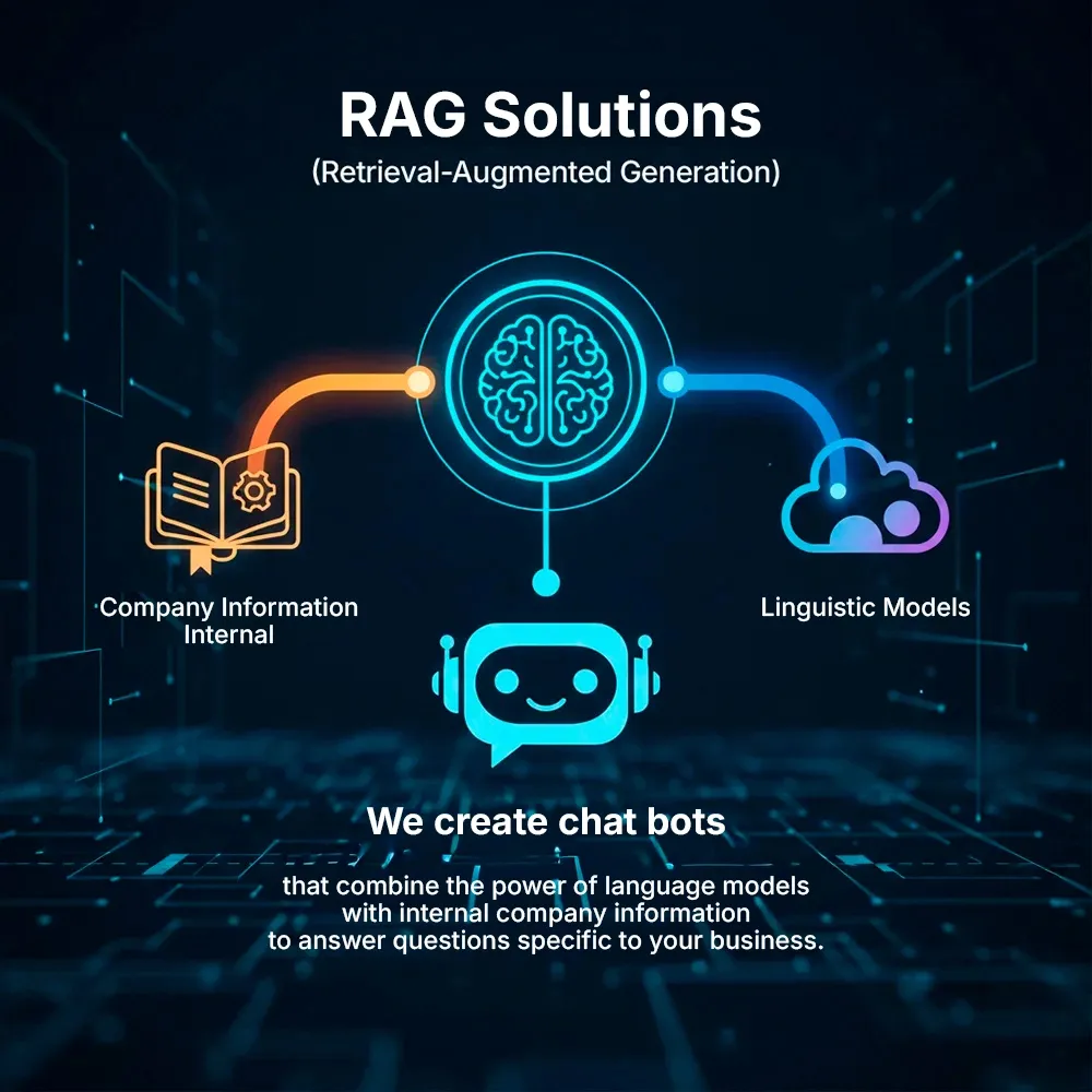We create Chatbots that combine the power of language models with your internal company information, to answer questions specific to your reality.