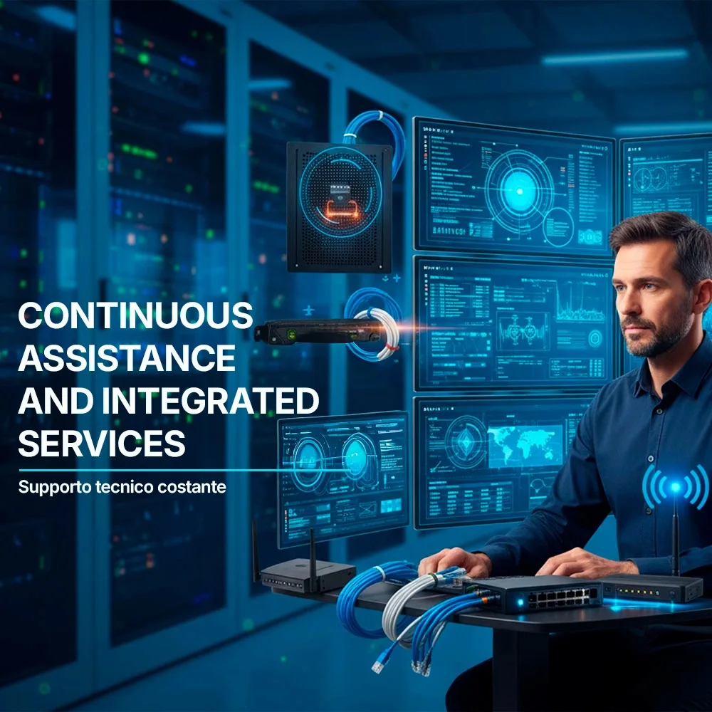 From dedicated internet lines (fiber, SD-WAN) to next-gen firewalls, through structured physical networks, managed switches, enterprise Wi-Fi with optimized coverage and VLAN segmentation, we guarantee 24/7 technical support from competent, certified, and customer-close people.