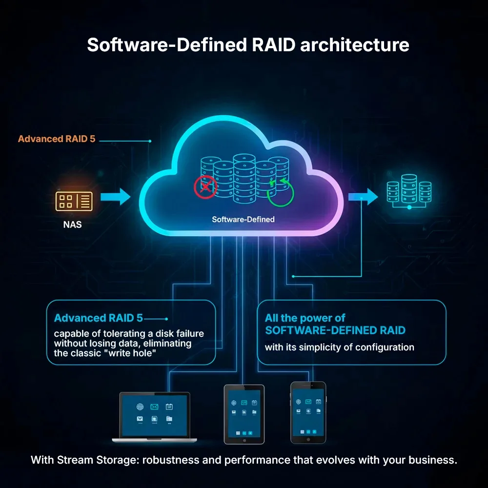 • It works like an evolved RAID 5, capable of tolerating the failure of one disk without data loss, eliminating the classic “write hole problem”.