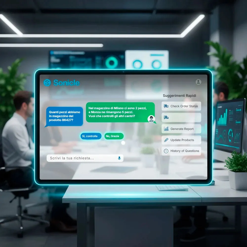 Colleghiamo l’A.I. ai sistemi gestionali tramite un protocollo di API standard, permettendo interrogazioni in linguaggio naturale: